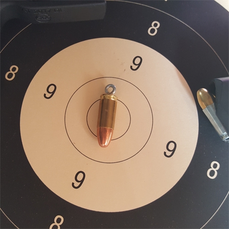 Eine Dekopatrone als Schlüsselanhänger im Kaliber 9mm Parabellum / 9mm Luger.
